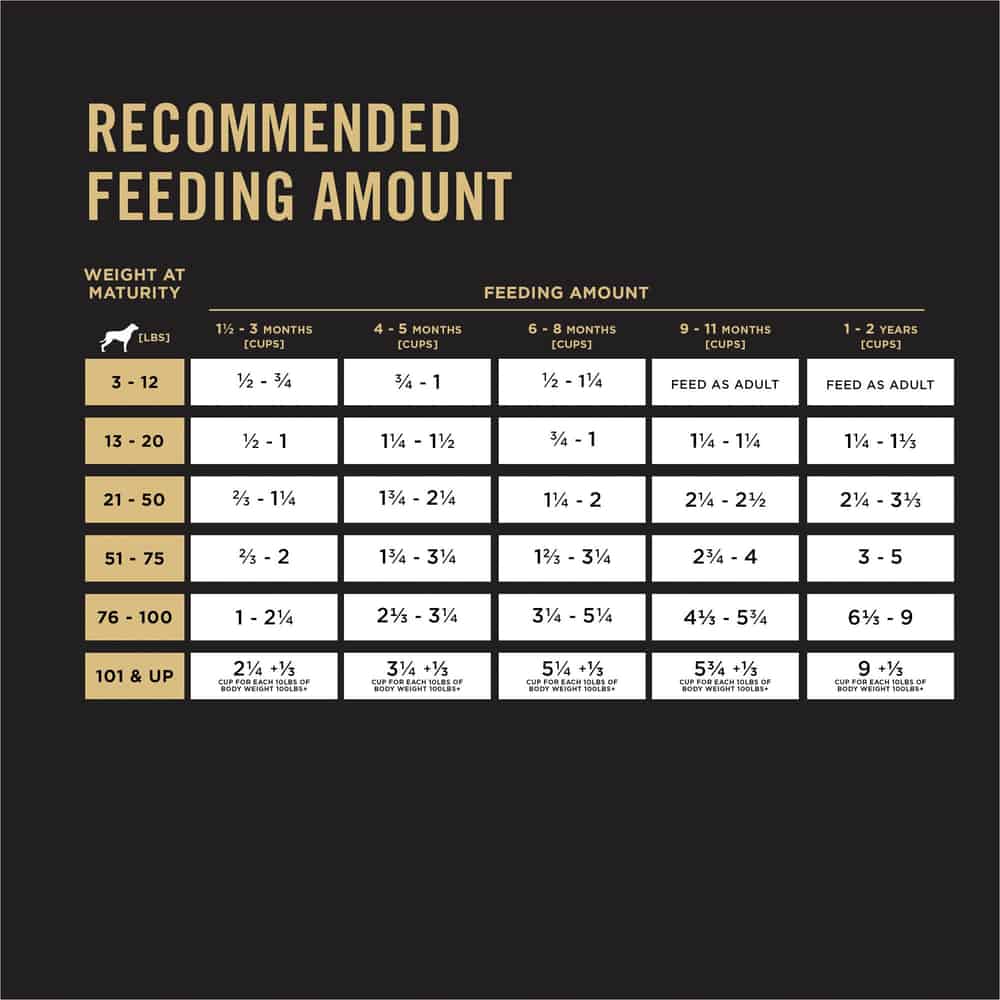 | 3 - 12 lbs | 1/2 - 3/4 cup | 3/4 - 1 cup | 1/2 - 1 1/4 cups | Feed as Adult | Feed as Adult |