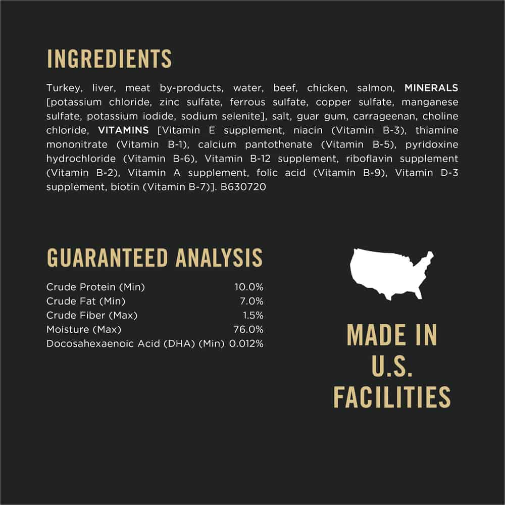 | Turkey, Liver, Meat By-Products, Water, Beef, Chicken, Salmon, MINERALS [Potassium Chloride, Zinc Sulfate, Ferrous Sulfate, Copper Sulfate, Manganese Sulfate, Potassium Iodide, Sodium Selenite], Salt, Guar Gum, Carrageenan, Choline Chloride, VITAMINS [Vitamin E Supplement, Niacin (Vitamin B-3), Thiamine Mononitrate (Vitamin B-1), Calcium Pantothenate (Vitamin B-5), Pyridoxine Hydrochloride (Vitamin B-6), Vitamin B-12 Supplement, Riboflavin Supplement (Vitamin B-2), Vitamin A Supplement, Folic Acid (Vitamin B-9), Vitamin D-3 Supplement, Biotin (Vitamin B-7)]. B630720 |