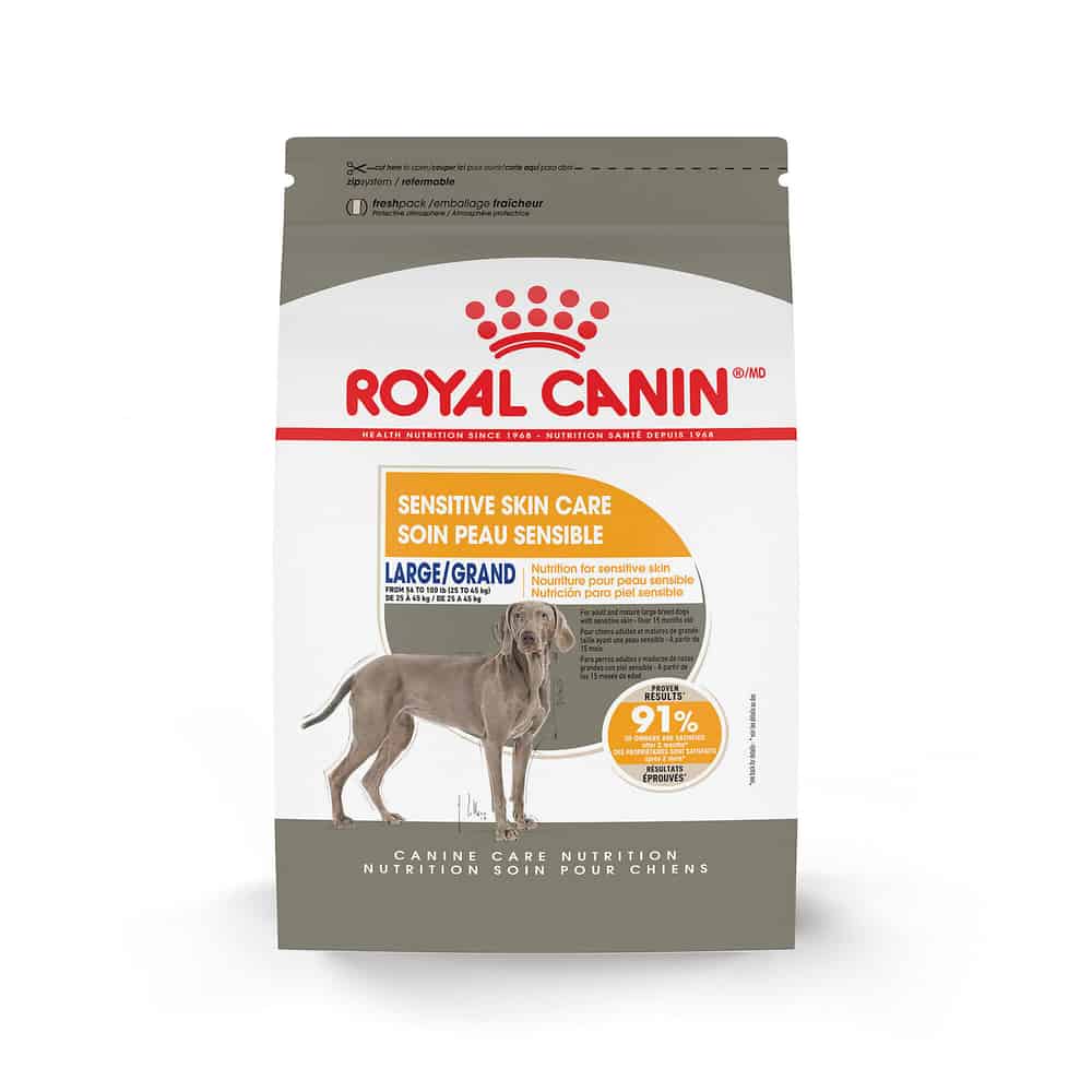 - TAILORED FOR DRY COATS: Royal Canin Large Sensitive Skin Care Dry Dog Food is formulated for large dogs 15 months and older weighing 56-100 lb with sensitive skin and dry coats