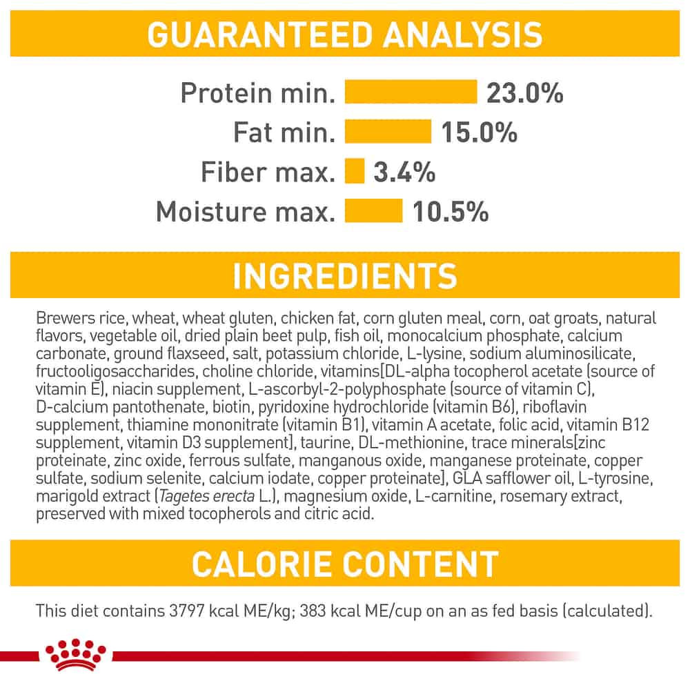 | Brewers rice, wheat, wheat gluten, chicken fat, corn gluten meal, corn, oat groats, natural flavors, vegetable oil, dried plain beet pulp, fish oil, monocalcium phosphate, calcium carbonate, flaxseed, salt, potassium chloride, L-lysine, sodium silico aluminate, fructooligosaccharides, vitamins [DL-alpha tocopherol acetate (source of vitamin E), niacin supplement, L-ascorbyl-2-polyphosphate (source of vitamin C), D-calcium pantothenate, biotin, pyridoxine hydrochloride (vitamin B6), riboflavin supplement, thiamine mononitrate (vitamin B1), vitamin A acetate, folic acid, vitamin B12 supplement, vitamin D3 supplement], taurine, choline chloride, DL-methionine, trace minerals [zinc proteinate, zinc oxide, ferrous sulfate, manganous oxide, manganese proteinate, copper sulfate, sodium selenite, calcium iodate, copper proteinate], GLA safflower oil, L-tyrosine, marigold extract (Tagetes erecta L.), magnesium oxide, L-carnitine, rosemary extract, preserved with mixed tocopherols and citric acid. |