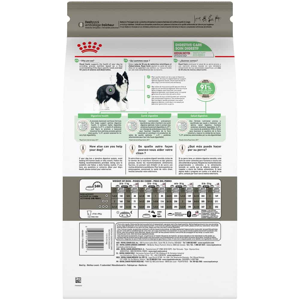 - FOR MEDIUM DOGS WITH SENSITIVE STOMACHS: Royal Canin Medium Digestive Care Dry Dog Food is formulated for medium dogs 12 months and older weighing 23-55 lb with a sensitive stomach