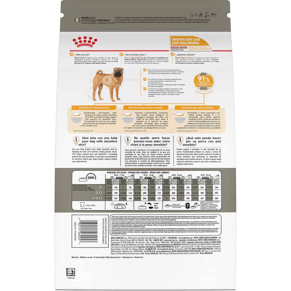 Royal Canin Medium Sensitive Skin Care Dry Dog Food is tailored nutrition to support your adult dog’s sensitive skin and coat. And 91% of owners saw an improvement in their dog’s skin after two months while feeding Royal Canin Sensitive Skin Care exclusively.