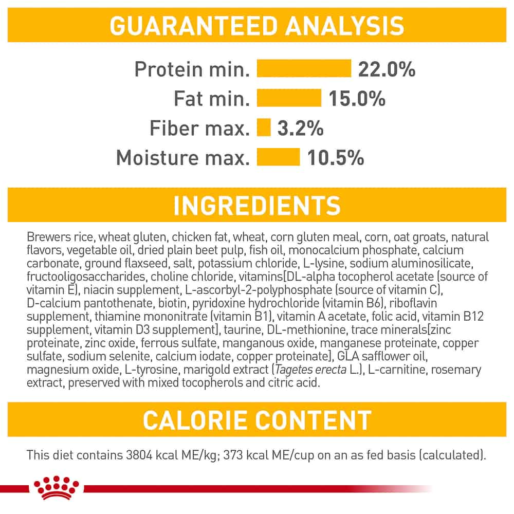 | Brewers rice, wheat gluten, chicken fat, wheat, corn gluten meal, corn, oat groats, natural flavors, vegetable oil, dried plain beet pulp, fish oil, monocalcium phosphate, calcium carbonate, ground flaxseed, salt, potassium chloride, L-lysine, sodium aluminosilicate, fructooligosaccharides, choline chloride, vitamins[DL-alpha tocopherol acetate (source of vitamin E), niacin supplement, L-ascorbyl-2-polyphosphate (source of vitamin C), D-calcium pantothenate, biotin, pyridoxine hydrochloride (vitamin B6), riboflavin supplement, thiamine mononitrate (vitamin B1), vitamin A acetate, folic acid, vitamin B12 supplement, vitamin D3 supplement], taurine, DL-methionine, trace minerals[zinc proteinate, zinc oxide, ferrous sulfate, manganous oxide, manganese proteinate, copper sulfate, sodium selenite, calcium iodate, copper proteinate], GLA safflower oil, magnesium oxide, L-tyrosine, marigold extract (Tagetes erecta L.), L-carnitine, rosemary extract, preserved with mixed tocopherols and citric acid. |
