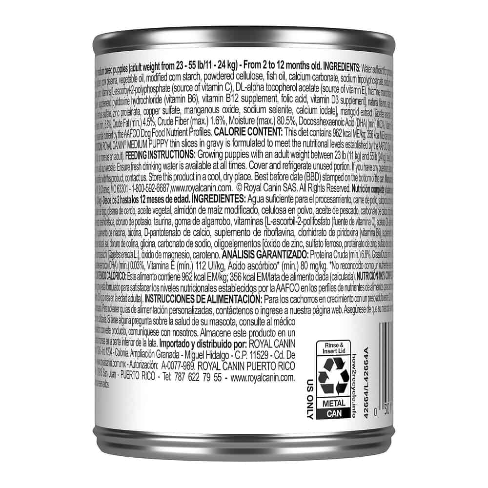 | Royal Canin Size Health Nutrition Medium Breed Puppy Thin Slices in Gravy Wet Dog Food is formulated to meet the nutritional levels established by the AAFCO Dog Food Nutrient Profiles for growth, including gestation/lactation.” |