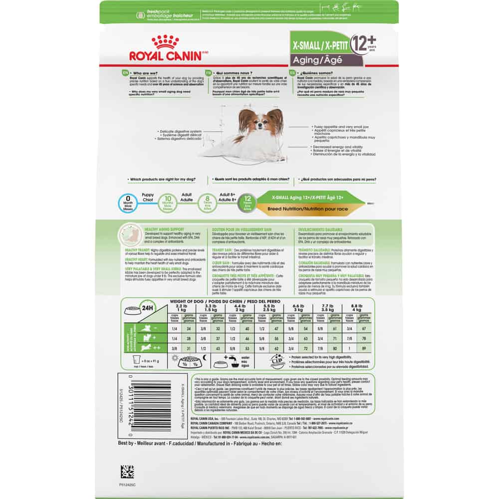Royal Canin Size Health Nutrition X-Small Breed Aging 12+ Dry Dog Food is formulated with just the right amount of calories to give your small dog the energy they need to help maintain a healthy weight and optimal body condition. Precise levels of fatty acids, like EPA and DHA, support healthy skin and a beauti