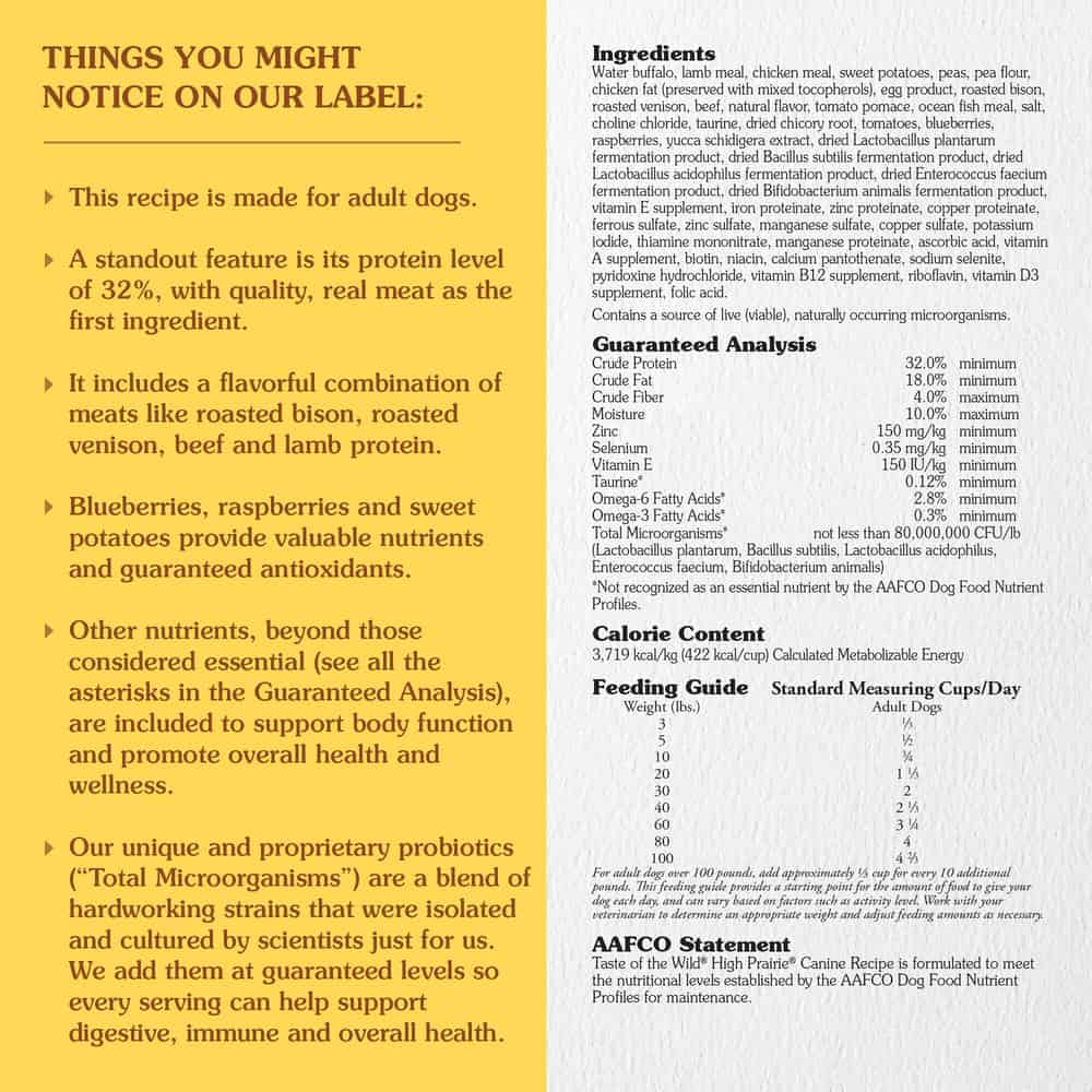 Taste of the Wild High Prairie Canine Recipe is formulated to meet the nutritional levels established by the AAFCO Dog Food Nutrient Profiles for maintenance.