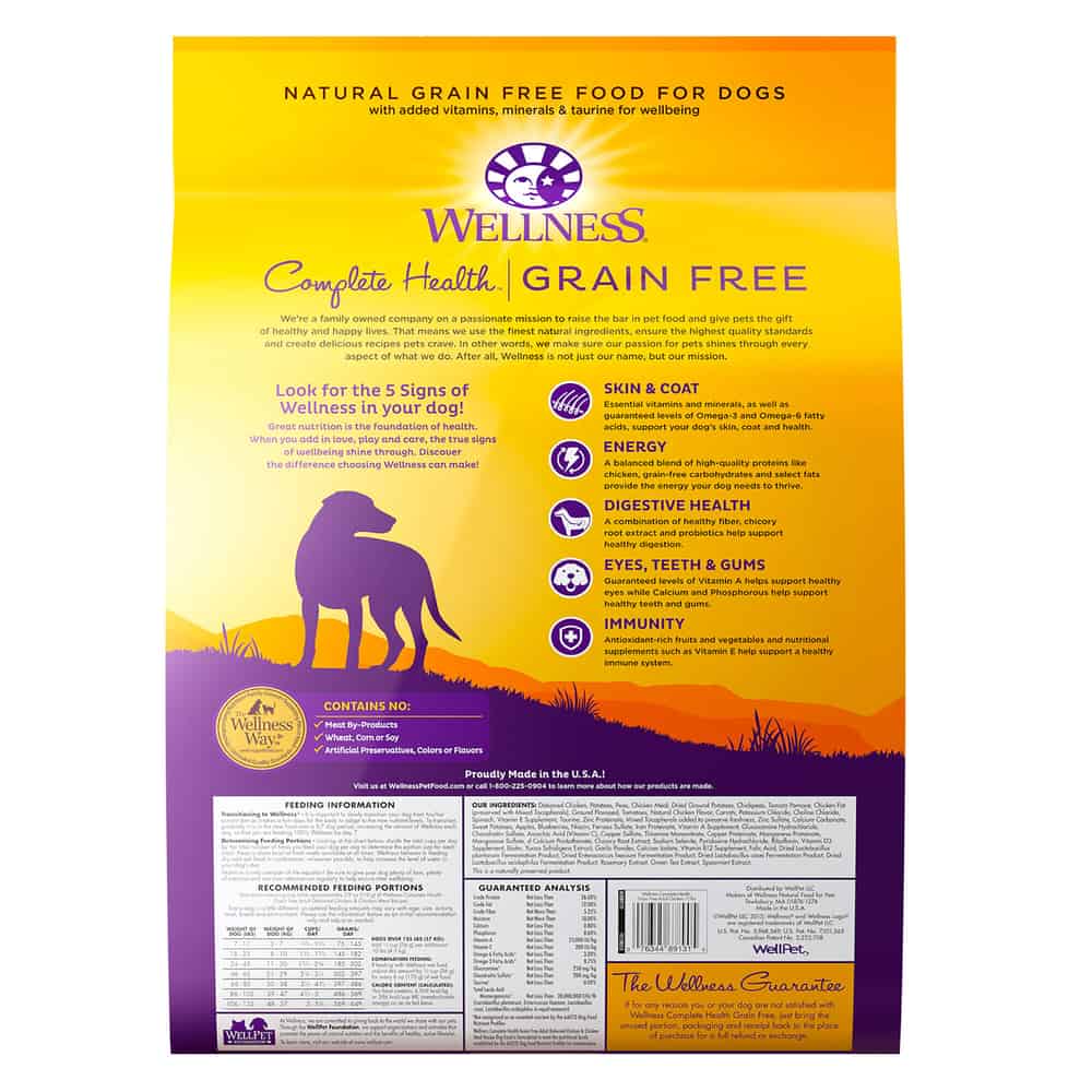 Wellness Complete Health Natural Dry Dog Food, Chicken Recipe, is a healthy, natural grain free dog food for adult dogs made with carefully chosen, authentic ingredients for everyday health and provide an optimal balance of nutrient-rich whole foods to fulfill the unique health needs of your dog, providing whole-body nutritional support to promote complete health.