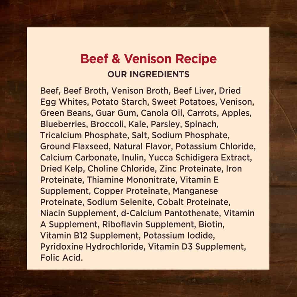 SAVORY TASTE YOUR DOG WILL LOVE: This all natural, grain free dog food is rich with delicious hearty cuts of premium proteins including beef & venison combined with real vegetables and essential vitamins and minerals