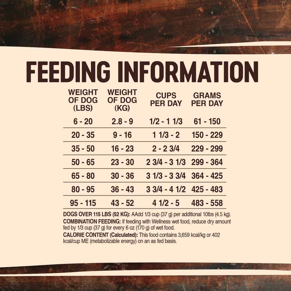 A mix of wet and dry dog food can make mealtime more enjoyable for your furry friend. If feeding with Wellness wet food, reduce dry amount by ⅓ cup for every 6 oz of wet food.