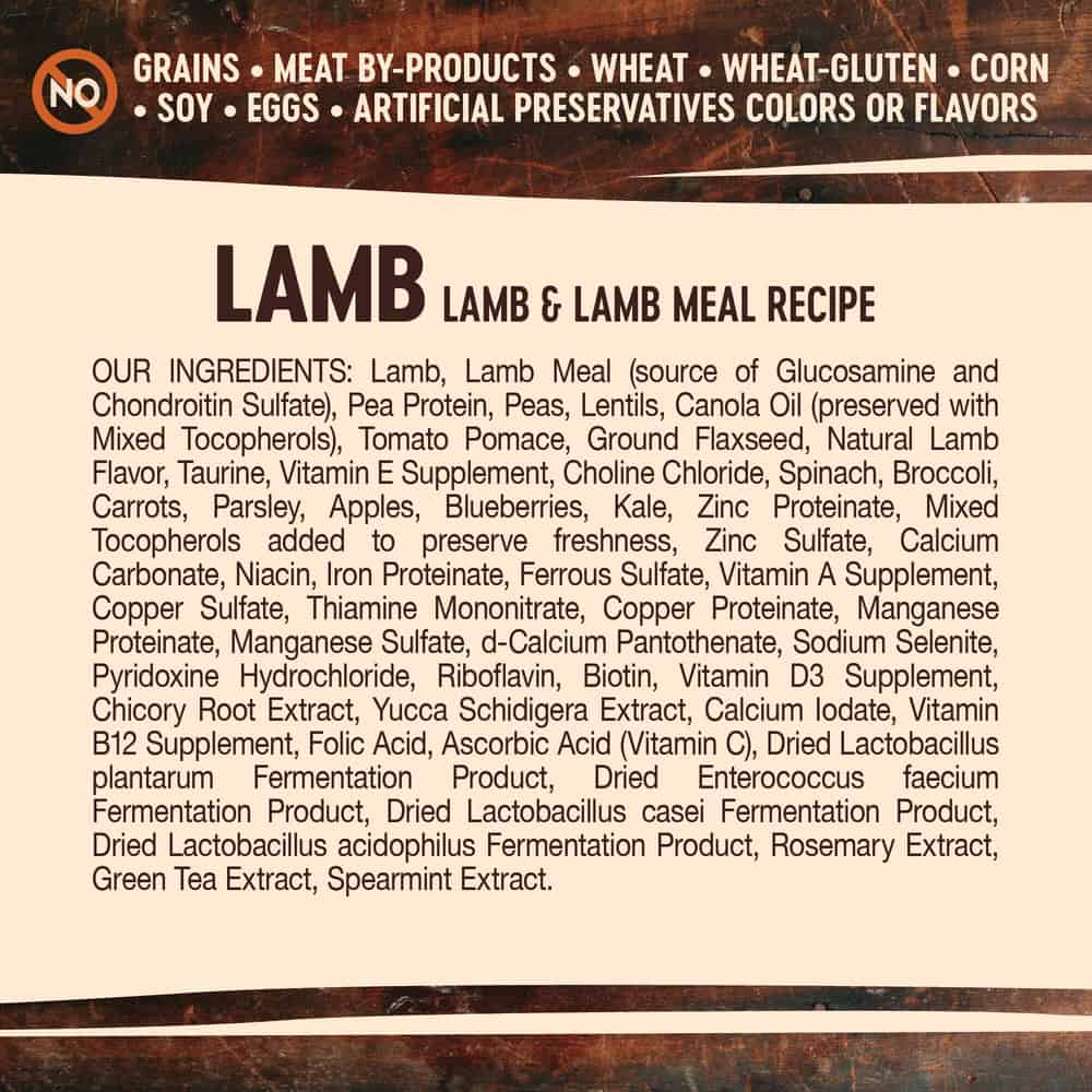 | Lamb, Lamb Meal (source of Glucosamine and Chondroitin Sulfate), Pea Protein, Peas, Lentils, Canola Oil (preserved with Mixed Tocopherols), Tomato Pomace, Ground Flaxseed, Natural Lamb Flavor, Taurine, Vitamin E Supplement, Choline Chloride, Spinach, Broccoli, Carrots, Parsley, Apples, Blueberries, Kale, Zinc Proteinate, Mixed Tocopherols added to preserve freshness, Zinc Sulfate, Calcium Carbonate, Niacin, Iron Proteinate, Ferrous Sulfate, Vitamin A Supplement, Copper Sulfate, Thiamine Mononitrate, Copper Proteinate, Manganese Proteinate, Manganese Sulfate, d-Calcium Pantothenate, Sodium Selenite, Pyridoxine Hydrochloride, Riboflavin, Biotin, Vitamin D3 Supplement, Chicory Root Extract, Yucca Schidigera Extract, Calcium Iodate, Vitamin B12 Supplement, Folic Acid, Ascorbic Acid (Vitamin C), Dried Lactobacillus plantarum Fermentation Product, Dried Enterococcus faecium Fermentation Product, Dried Lactobacillus casei Fermentation Product, Dried Lactobacillus acidophilus Fermentation Product, Rosemary Extract, Green Tea Extract, Spearmint Extract. |