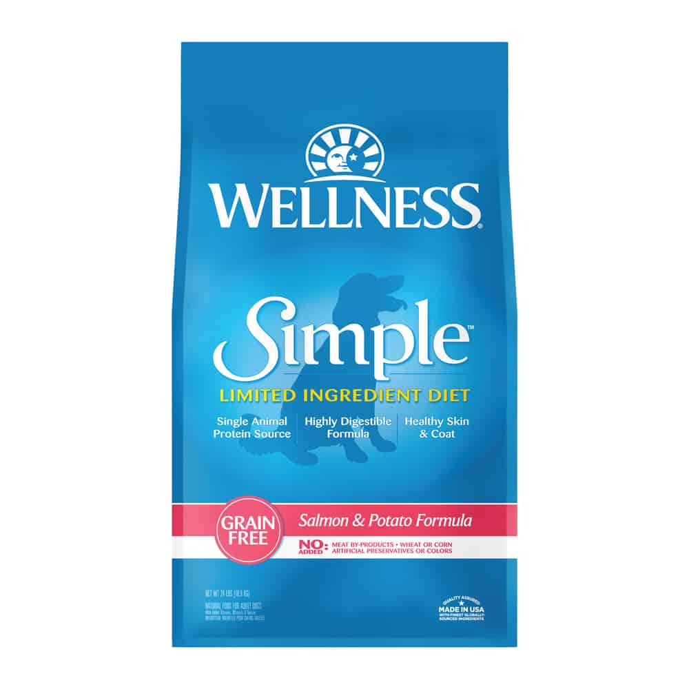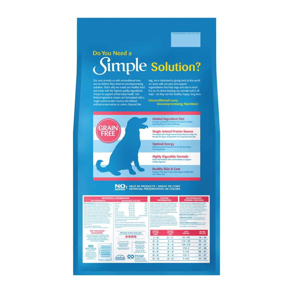 Wellness Simple Limited Ingredient Diet dog food formulas keep it simple with a balance of single source of protein and easily digestible carbohydrates, without extra fillers or additives, including no meat by-products, wheat, corn, dairy, eggs, artificial preservatives, colors or flavors.