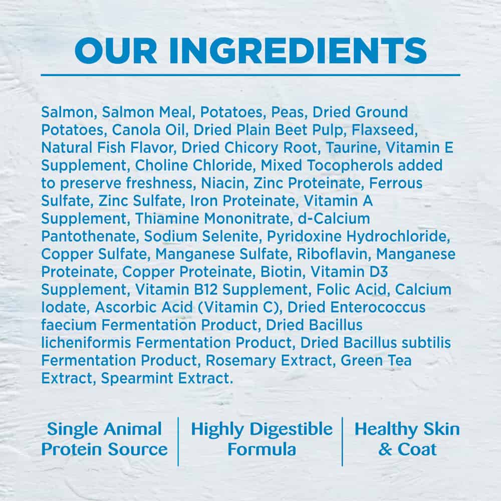 | Salmon, Salmon Meal, Potatoes, Peas, Dried Ground Potatoes, Canola Oil, Dried Plain Beet Pulp, Flaxseed, Natural Fish Flavor, Dried Chicory Root, Taurine, Vitamin E Supplement, Choline Chloride, Mixed Tocopherols added to preserve freshness, Niacin, Zinc Proteinate, Ferrous Sulfate, Zinc Sulfate, Iron Proteinate, Vitamin A Supplement, Thiamine Mononitrate, d-Calcium Pantothenate, Sodium Selenite, Pyridoxine Hydrochloride, Copper Sulfate, Manganese Sulfate, Riboflavin, Manganese Proteinate, Copper Proteinate, Biotin, Vitamin D3 Supplement, Vitamin B12 Supplement, Folic Acid, Calcium Iodate, Ascorbic Acid (Vitamin C), Dried Enterococcus faecium Fermentation Product, Dried Bacillus licheniformis Fermentation Product, Dried Bacillus subtilis Fermentation Product, Rosemary Extract, Green Tea Extract, Spearmint Extract. |