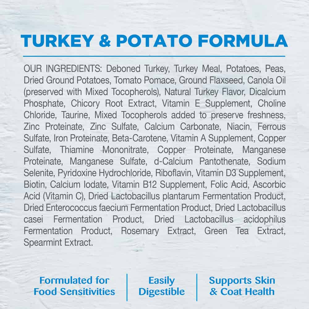 - LIMITED INGREDIENT ADULT DOG FOOD: All natural, limited ingredient recipe crafted with a single source of protein from turkey, and expertly balanced with easily digestible carbohydrates from potatoes, without any extra fillers.