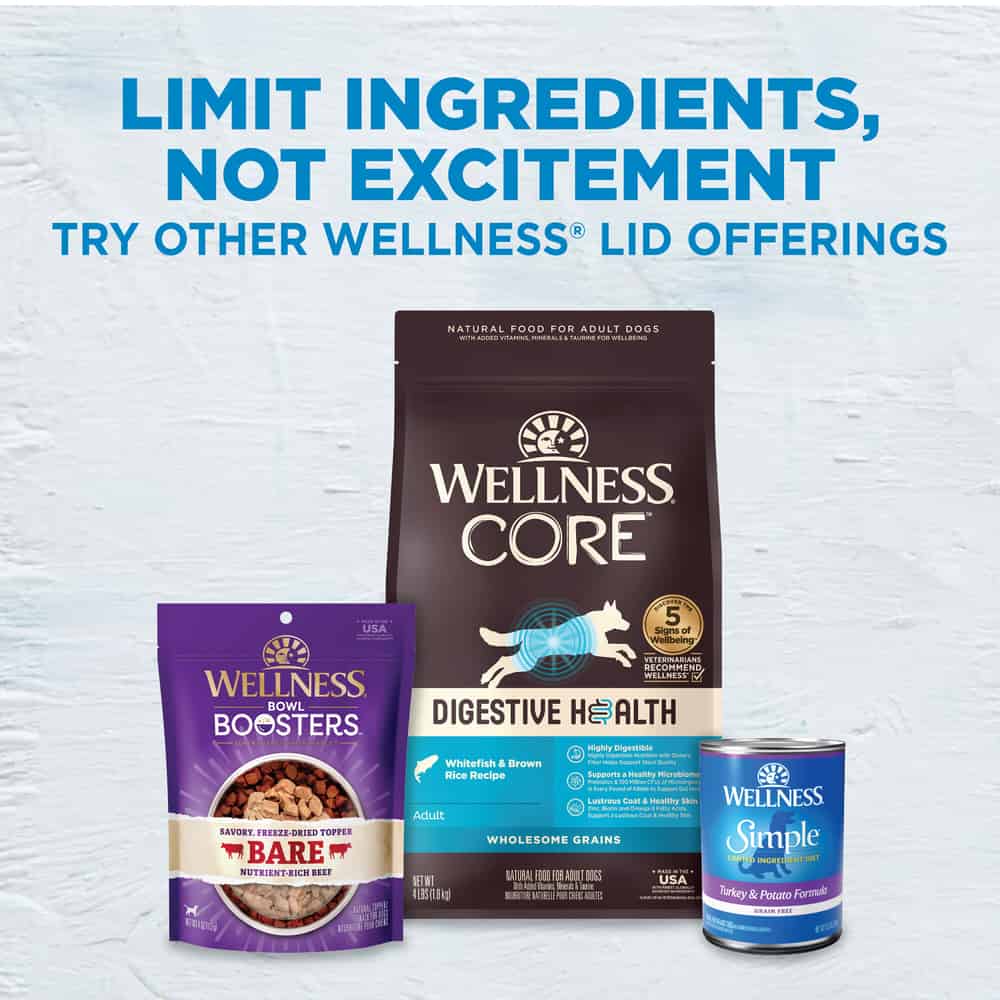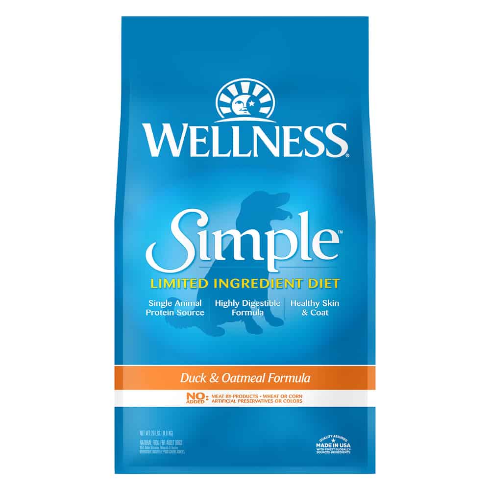 Wellness Simple Limited Ingredient Diet dog food formulas keep it simple with a balance of single source of protein and easily digestible carbohydrates, without extra fillers or additives, including no meat by-products, wheat, corn, dairy, eggs, artificial preservatives, colors or flavors.