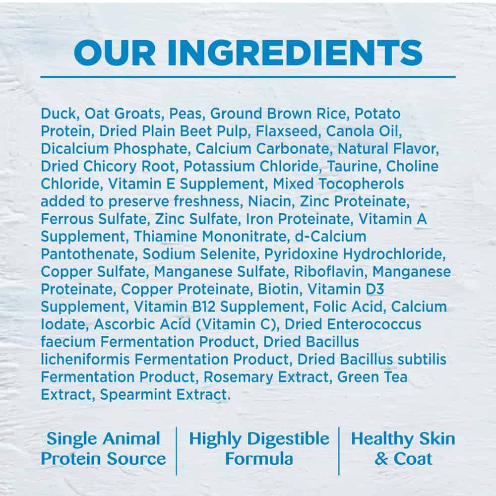 | Duck, Oatmeal, Peas, Ground Brown Rice, Potato Protein, Dried Plain Beet Pulp, Flaxseed, Canola Oil, Dicalcium Phosphate, Calcium Carbonate, Natural Flavor, Dried Chicory Root, Potassium Chloride, Taurine, Choline Chloride, Vitamin E Supplement, Mixed Tocopherols added to preserve freshness, Niacin, Zinc Proteinate, Ferrous Sulfate, Zinc Sulfate, Iron Proteinate, Vitamin A Supplement, Thiamine Mononitrate, d-Calcium Pantothenate, Sodium Selenite, Pyridoxine Hydrochloride, Copper Sulfate, Manganese Sulfate, Riboflavin, Manganese Proteinate, Copper Proteinate, Biotin, Vitamin D3 Supplement, Vitamin B12 Supplement, Folic Acid, Calcium Iodate, Ascorbic Acid (Vitamin C), Dried Enterococcus faecium Fermentation Product, Dried Bacillus licheniformis Fermentation Product, Dried Bacillus subtilis Fermentation Product, Rosemary Extract, Green Tea Extract, Spearmint Extract. |