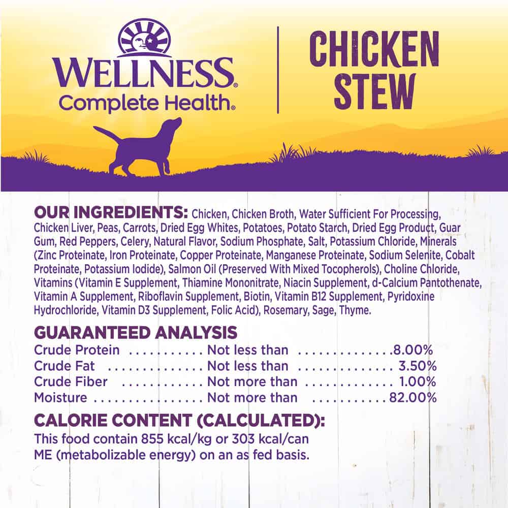 | Wellness Chicken Stew Dog Food is formulated to meet the nutritional levels established by the AAFCO Dog Food Nutrient Profiles for growth & maintenance. |