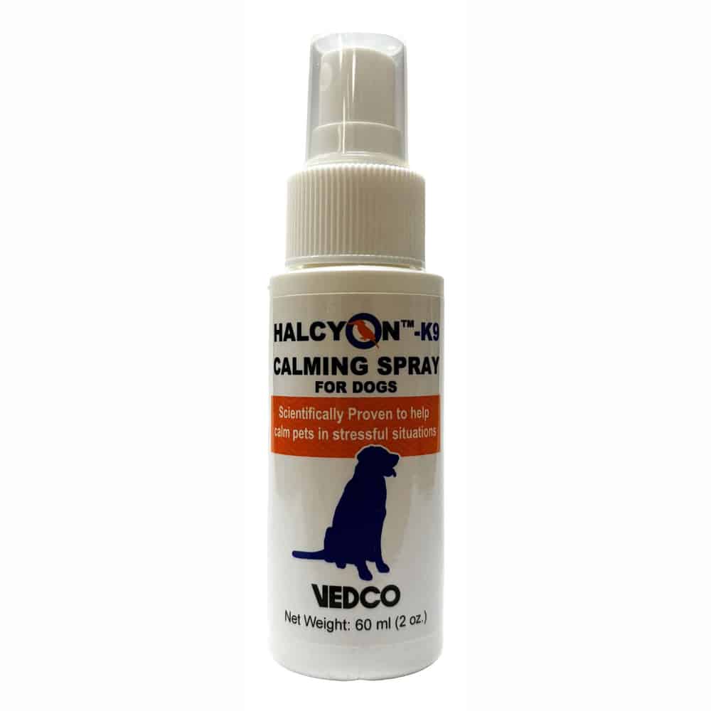 - Use Halcyon-K9 Calming Spray when your dog is experiencing stress or anxiety, such as during: Travel, car rides, plane trips, Vet visits, Grooming appointments, Loud noises, thunderstorms, fireworks , New environments or situations, or separation