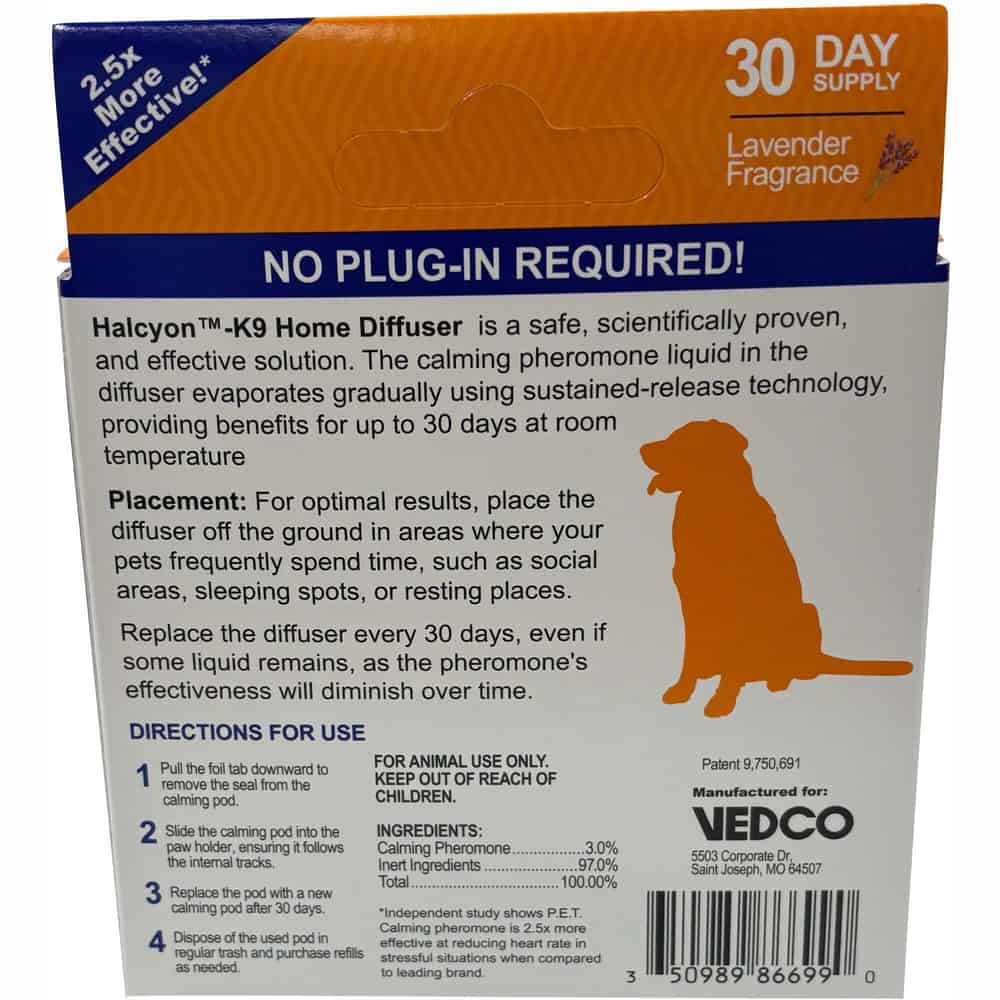The Halcyon-K9 Diffuser is a plug-in device that emits a synthetic version of the dog appeasing pheromone (DAP), which is naturally released by mother dogs to calm and reassure their puppies. This helps create a calming and comforting environment for dogs, reducing stress and anxiety.