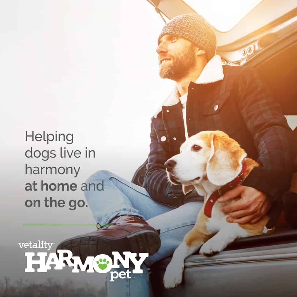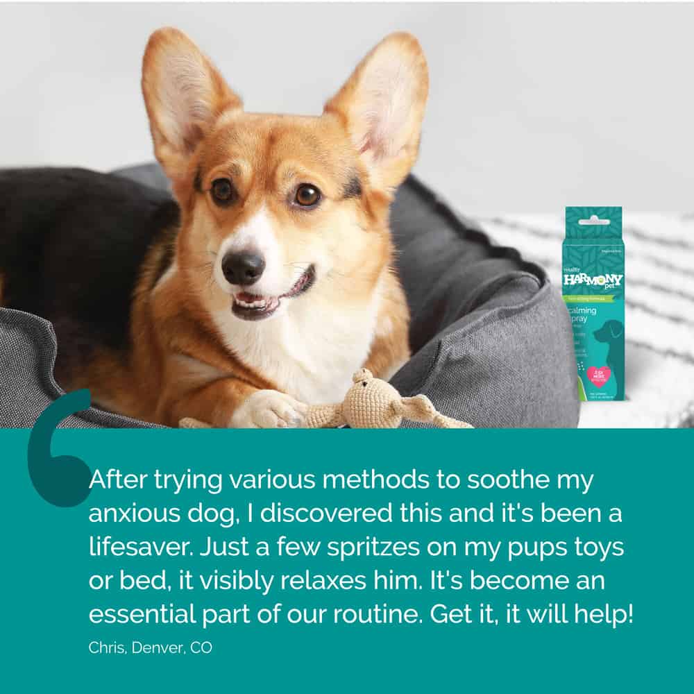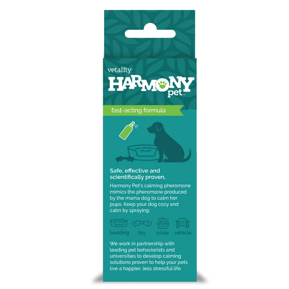 Harmony Pet Calming Spray for Dogs is fast-acting. This technology uses P.E.T. pheromone to help calm dogs by mimicking the maternal pheromone from momma dog to soothe her pups. This technology helps the pheromone quickly enter the nasal cavity, providing short term relief. Dogs of all ages recognize this calming pheromone for life. Helping dogs live in harmony where ever they go.