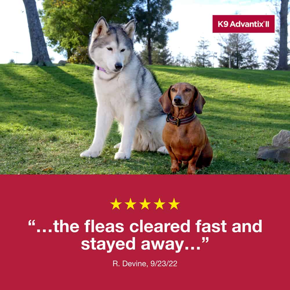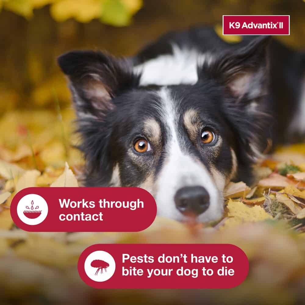 K9 Advantix II is a monthly preventative for dogs that offers comprehensive protection against ticks, fleas, mosquitoes, biting flies, and chewing lice. K9 Advantix II is a top veterinarian-recommended brand because it repels and kills all life stages of fleas (eggs, pupae, larvae, and adult fleas) and ticks (Deer ticks, American dog ticks, Brown dog ticks, and Lone Star ticks). K9 Advantix II kills 98-100 percent of fleas within 12 hours and continues working for one month to prevent infestations. Fleas and ticks are killed on contact with a treated dog, which means that fleas don't have to bite and ticks don't have to attach to die. This helps prevent transmission of flea-borne and tick-borne diseases such as tapeworms, Lyme disease, tick paralysis, ehrlichia, and Rocky Mountain spotted fever. Killing fleas before they bite may also help prevent skin allergies caused by flea saliva. As well, K9 Advantix II repels mosquitoes before they bite, which may help prevent transmission of heartworms. K9 Advantix II protects your pet before parasites have a chance to bite, not after.