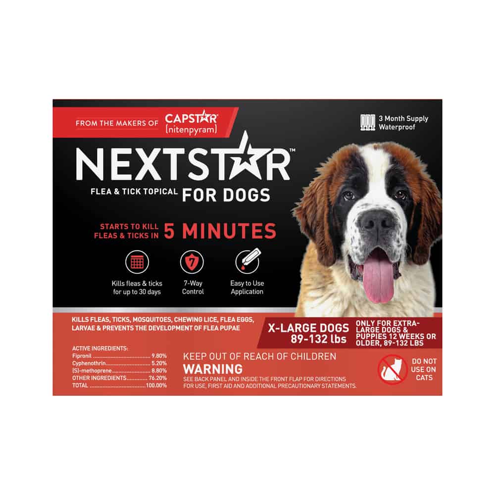 • NEXTSTAR Flea & Tick Topical provides effective dog flea and tick control for 30 days with just one application. This fast-acting waterproof topical kills fleas, ticks, mosquitoes, chewing lice, flea eggs, flea larvae, and prevents the development of flea pupae