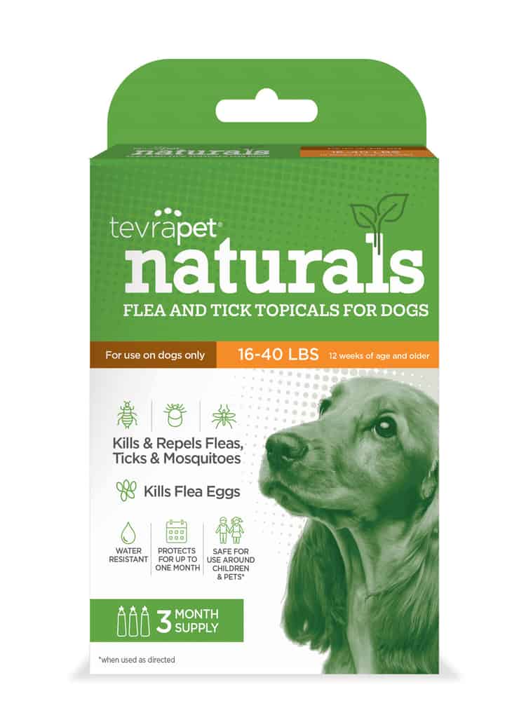 Tevrapet® Naturals Flea & Tick Topicals for Dogs, naturally and effectively, provides 30 days of protection from fleas, ticks & mosquitoes. Powered by a botanical blend of essential oils and natural oils, this easy-to-use topical naturally protects from bug bites, rashes, flea bites, dermatitis & helps prevent flea reinfestation. Water resistant. Safe for use around children and pets. For Dogs 12 weeks of age or older.
