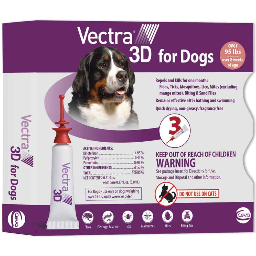 Vectra 3D is for external use only. Avoid getting Vectra 3D in your dog's eyes and mouth. Do not apply Vectra 3D on debilitated, aged, medicated, pregnant or nursing dogs, or dogs that are sensitive to pesticide products without first consulting your veterinarian.