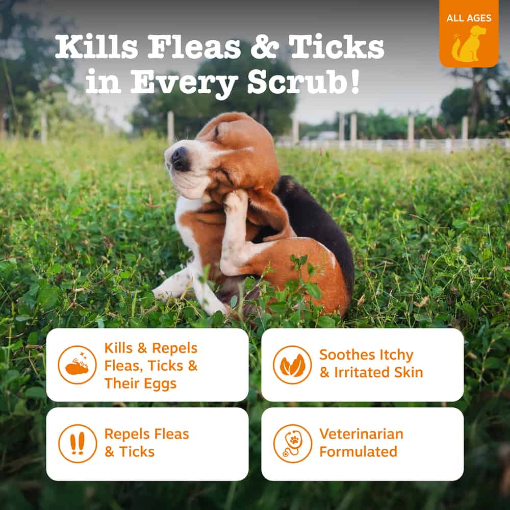 - A soothing bath wash that helps eliminate fleas, ticks, and their eggs while cleansing your dog’s coat.