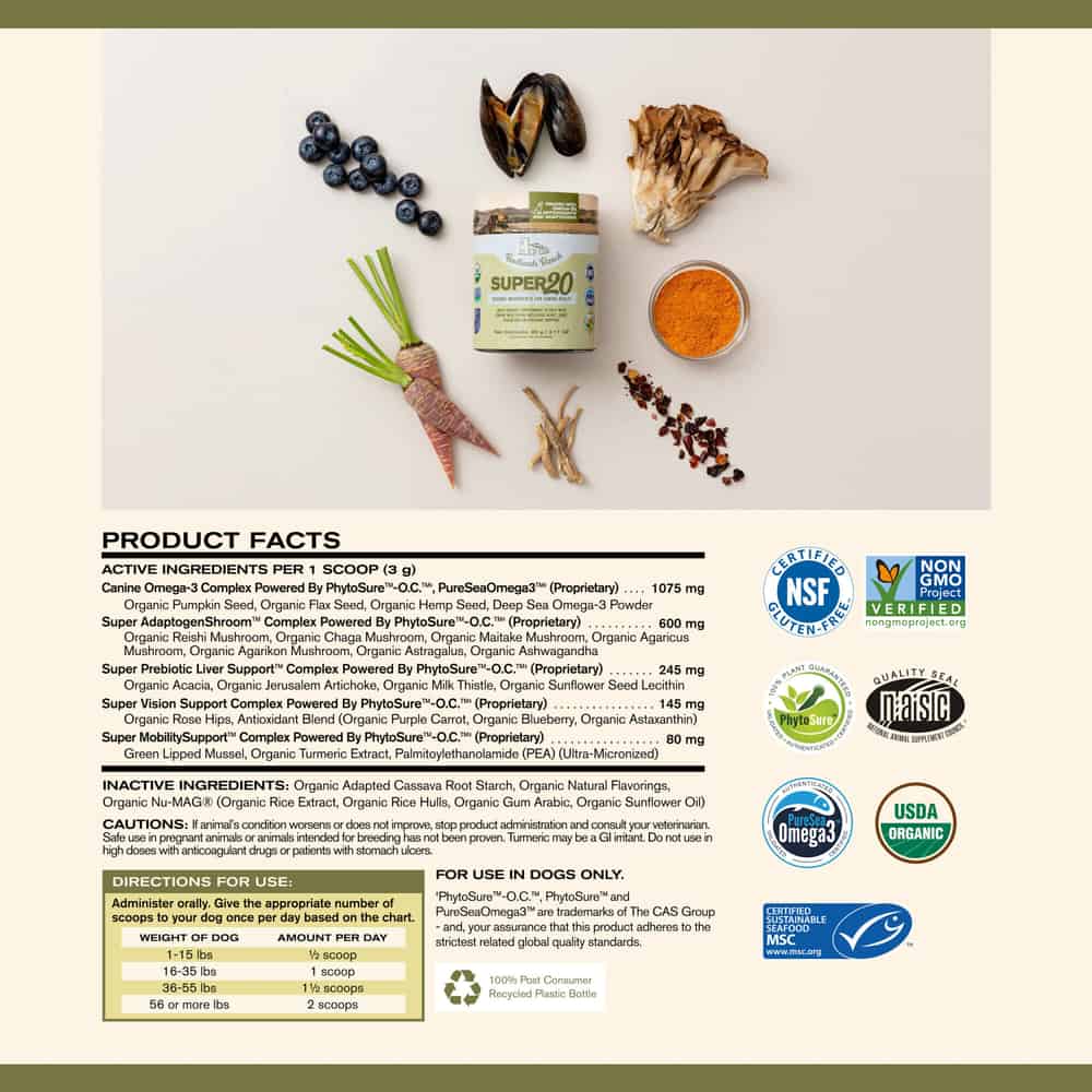 Super20 is a multi-benefit canine supplement designed to support overall health, energy, and well-being from nose to tail. It’s a superfood powder blend containing 20 powerful ingredients like herbs, seeds, mushrooms, fruits, and vegetables that target various aspects of a dog’s health including heart, joint, vision, and antioxidant support.
