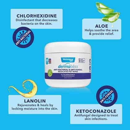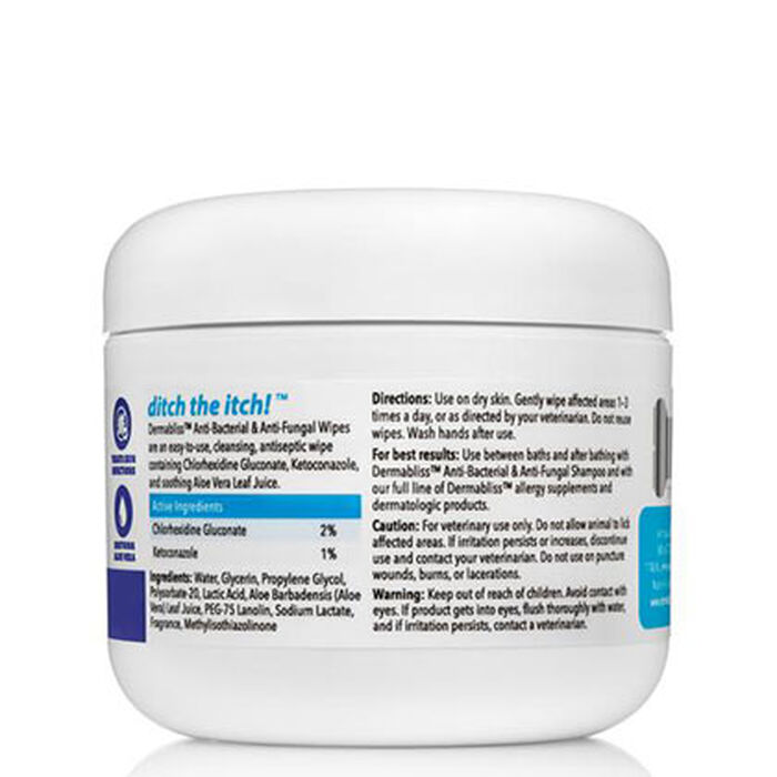 Dermabliss Anti-Bacterial & Anti-Fungal Medicated Wipes are veterinary strength wipes that contain 2% Chlorhexidine, a disinfectant that decreases bacteria on the skin, and 1% Ketoconazole, an antifungal designed to treat skin infections like ringworm and seborrhea.