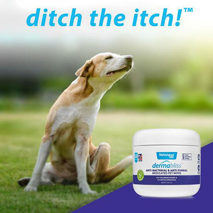 Dermabliss Anti-Bacterial & Anti-Fungal Medicated Wipes were created by veterinarians to treat skin infections using a soothing yet effective medicated formula. Dermabliss Wipes are an easy-to-use, cleansing, antiseptic wipe containing Chlorhexidine Gluconate, Ketoconazole, and soothing Aloe Vera Leaf Juice. The small wipes are great for on the go, in-home, or anywhere pets need relief from itchy paws and skin. Great for cleaning paws, treating ringworm, and hot spots