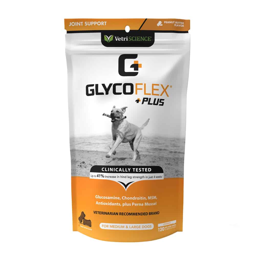 GlycoFlex Plus joint supplement for dogs provides clinically proven nutritional joint support for working dog breeds, competitive and senior dogs. It is clinically proven to increase hind leg strength up to 41% in just four weeks. This new formula for hip and joint care includes more active ingredients than other leading brands including glucosamine and chondroitin as well as perna and DMG for maximum nutritional absorption and effectiveness, all in a delicious bacon, duck, or peanut butter-flavored chew.