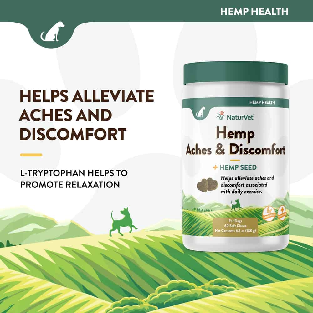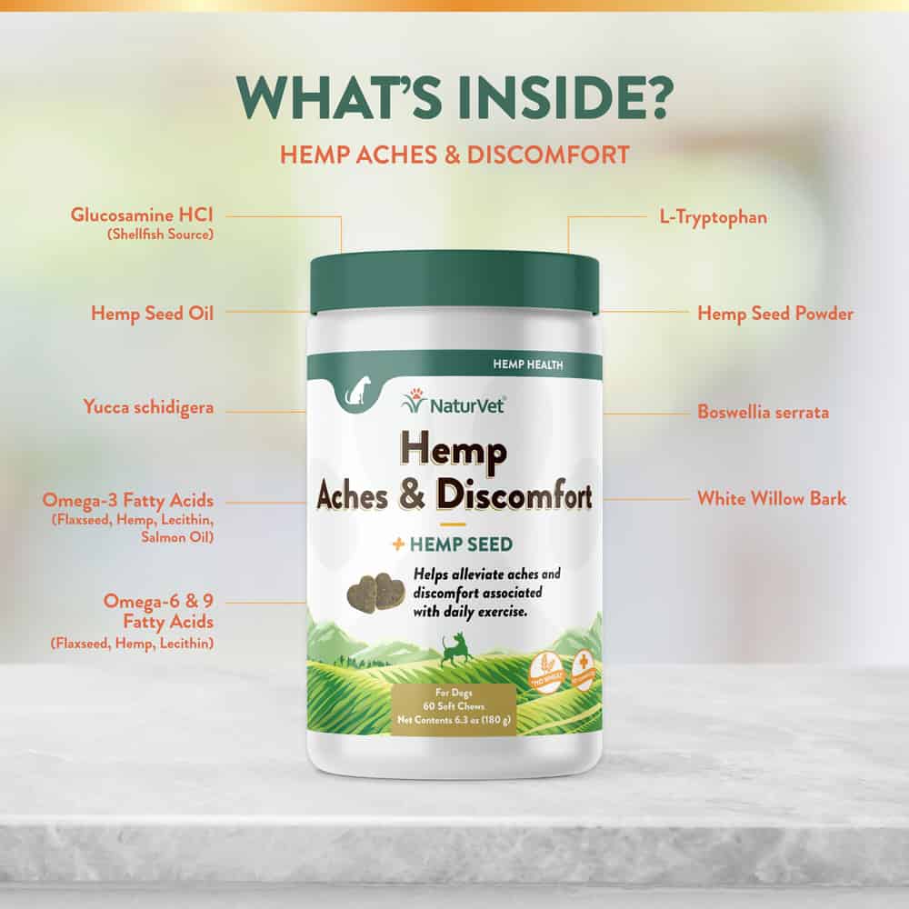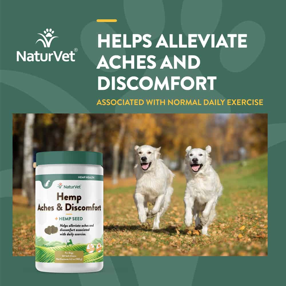 NaturVet Hemp Aches & Discomfort Plus Hemp Seed Supplement helps alleviate aches and discomfort associated with normal daily exercise and activity.