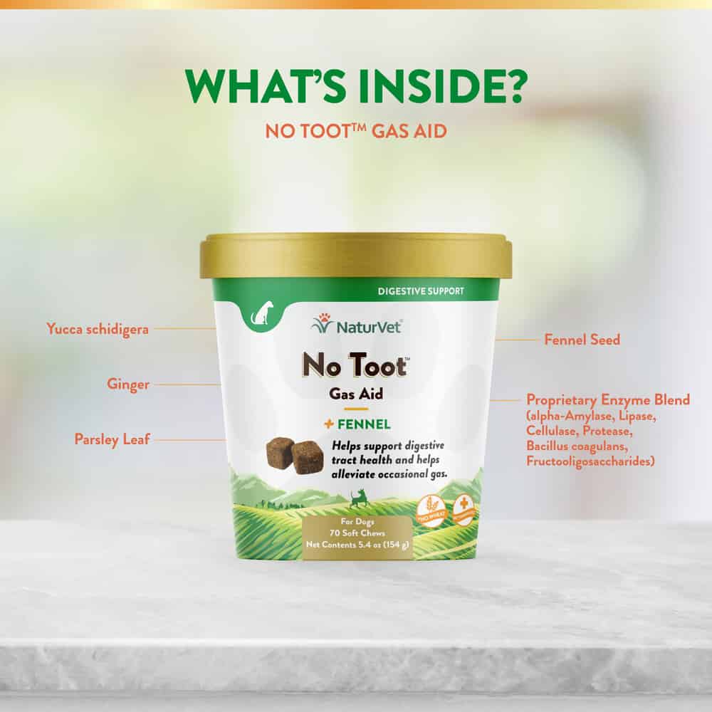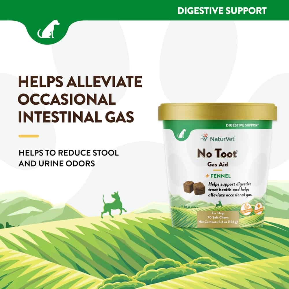 NaturVet No Toot Gas Aid Soft Chews alleviate intestinal gas and reduce stool and urine odors. It is formulated for dogs over the age of 12 weeks.