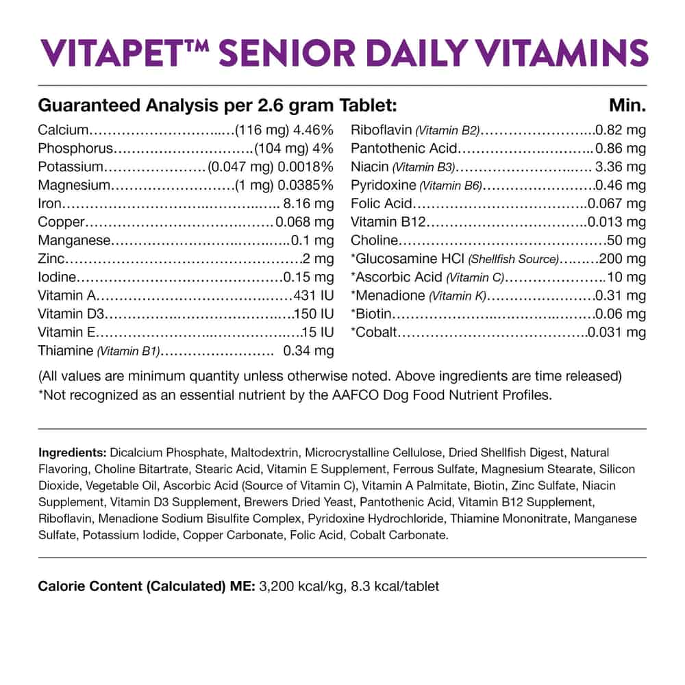 Provides senior dogs with a full spectrum of vitamins and minerals that may be missing from daily diet, plus Glucosamine for added joint support.