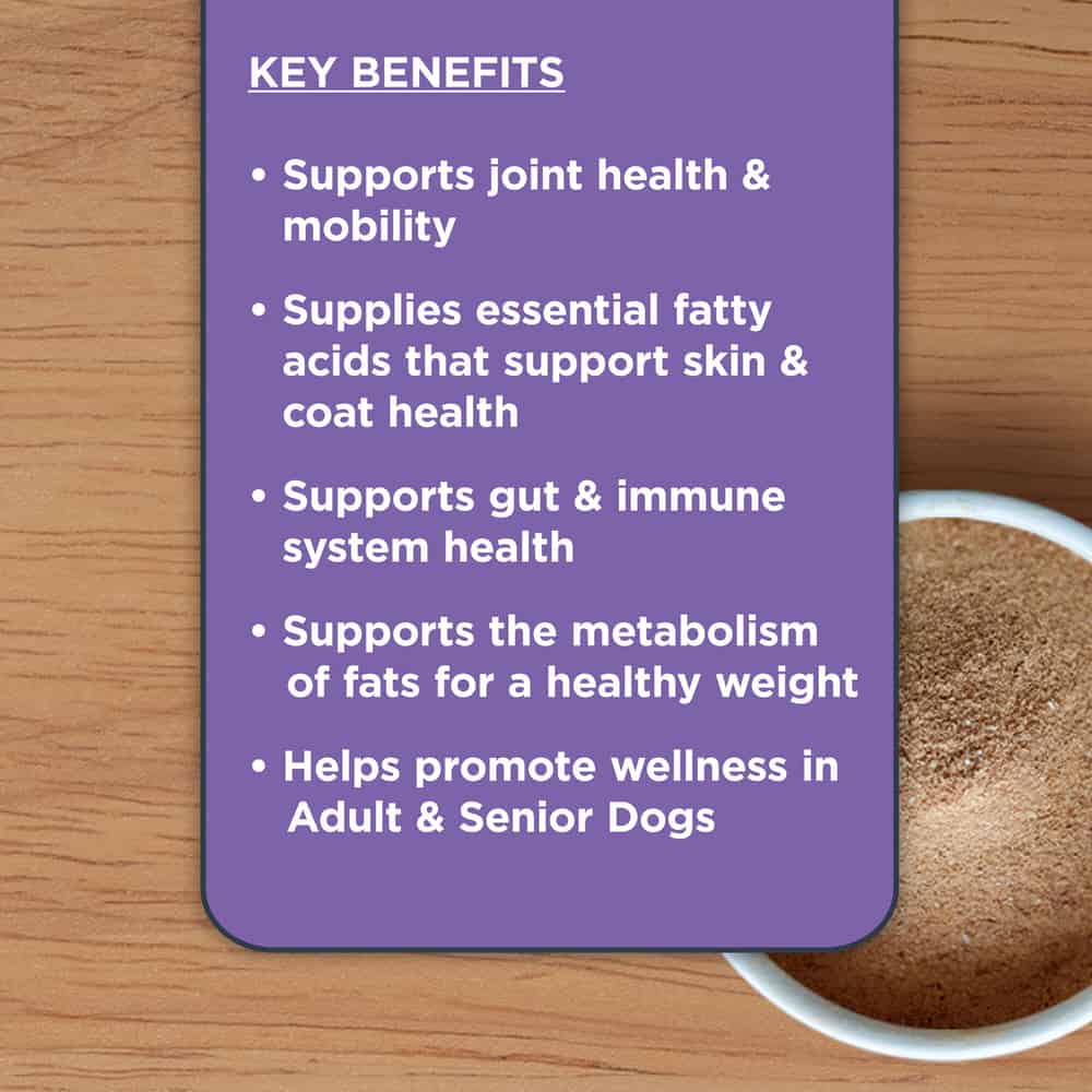 Scientifically-formulated with a variety of functional ingredients featuring Glucosamine Hydrochloride, Chondroitin Sulfate, Flaxseed, & Fish Oil. In addition, this unique blend also contains Probiotics and L-Carnitine, and features a savory Chicken Bone Broth that's richly flavorful for the pickiest pets. Simply sprinkle over your dog's favorite food and help them go from good to best with every meal.