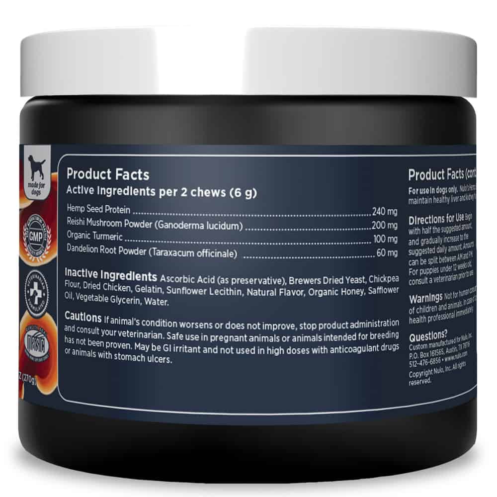 Nulo's Hemp & Mushroom Soft Chews help support healthy liver and kidney function for your dog.