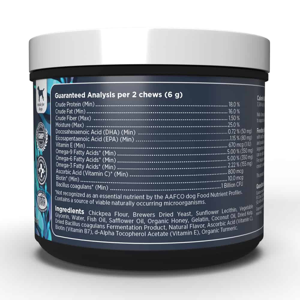 Scientifically formulated with a variety of functional ingredients featuring Marine Fish Oil (a blend of sardine, herring, mackerel and anchovy), Coconut Oil and Dried Kelp and Organic Turmeric. In addition, these soft chews also contain Probiotics, Biotin and Vitamins C & E. Together, these advanced ingredients supply key nutrients to help support your pup’s skin health