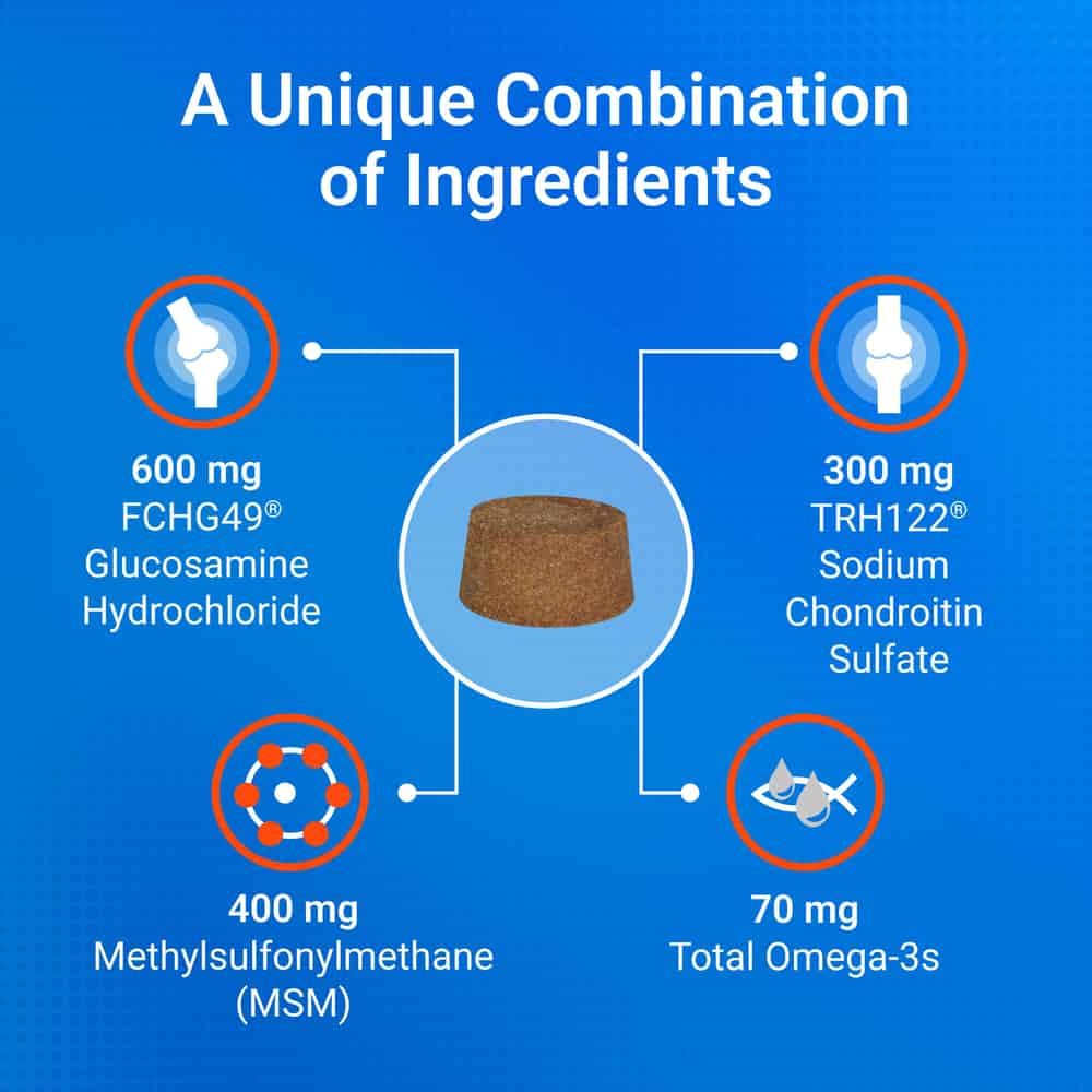 - Contains Glucosamine for Dogs - Cosequin contains glucosamine hydrochloride (FCHG49®) and sodium chondroitin sulfate (TRH122®), plus methylsulfonylmethane (MSM). This unique combination of ingredients supports healthy joints.