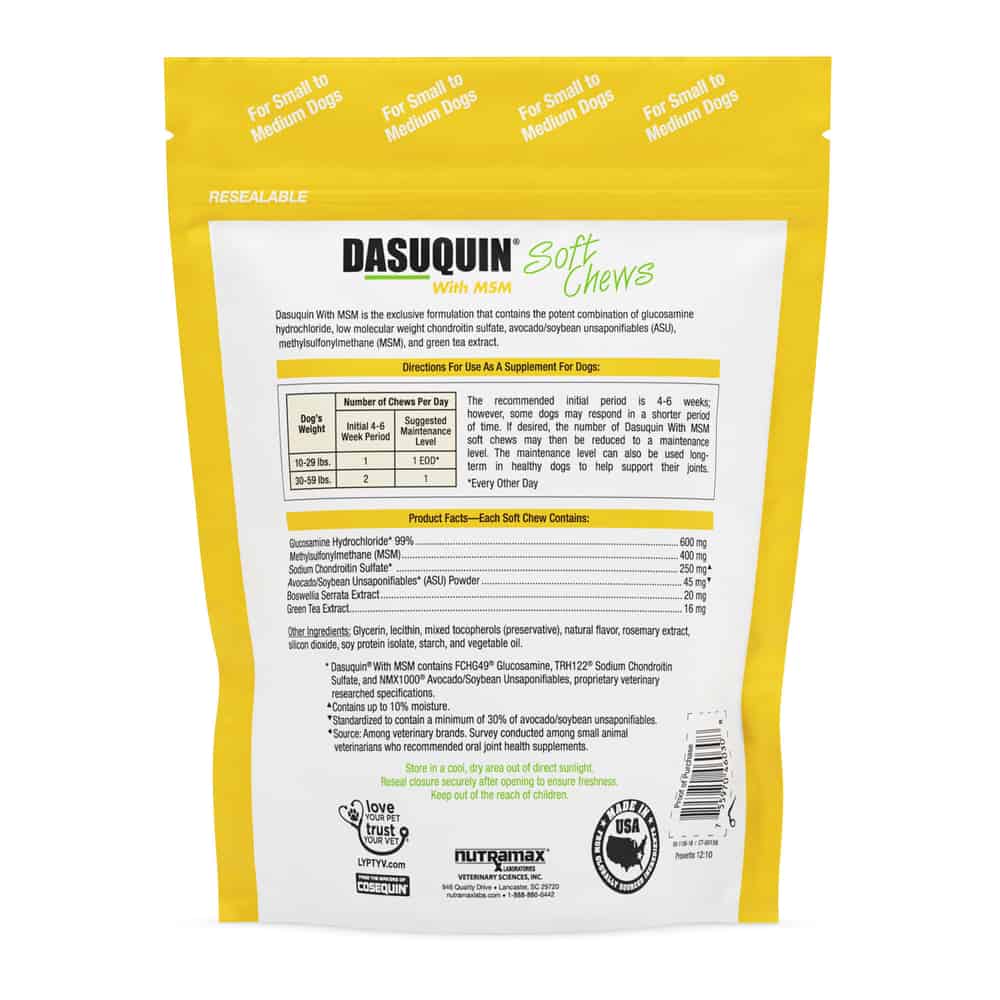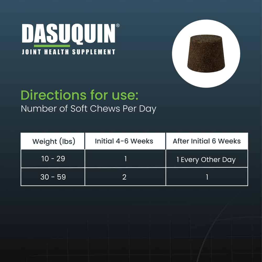 - The recommended initial period is 4-6 weeks; however, some dogs may respond in a shorter period of time. If desired, the number of Dasuquin With MSM Soft Chews may then be reduced to a maintenance level.