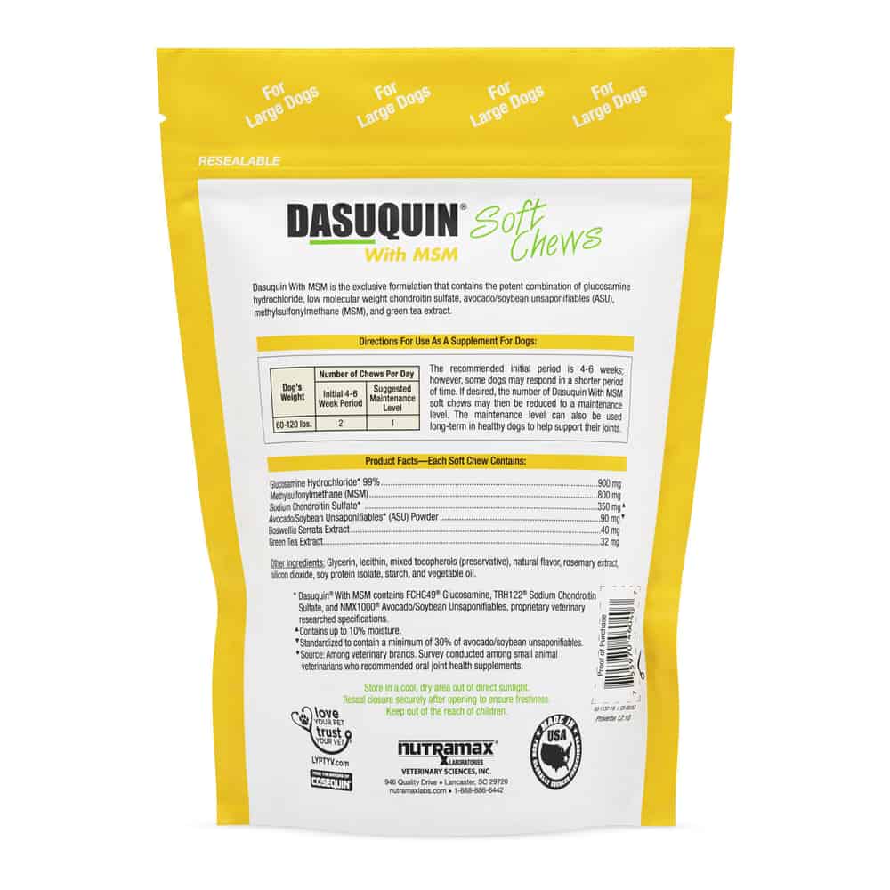 Nutramax Dasuquin with MSM Soft Chews for Dogs support joint health in dogs by inhibiting the breakdown of cartilage and promoting cartilage matrix production. Cell culture research has shown that the specific glucosamine and low molecular weight chondroitin sulfate synergistically stimulate cartilage matrix production. ASU (avocado/soybean unsaponifiables) also acts synergistically with glucosamine and chondroitin sulfate and helps protect cartilage and support healthy joint function.