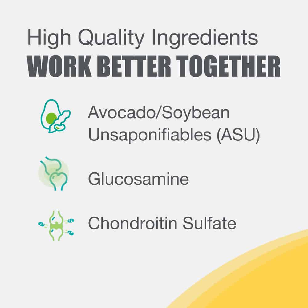 - Contains a patented combination of glucosamine, chondroitin sulfate, and ASU that works synergistically for more effective joint support than glucosamine alone.