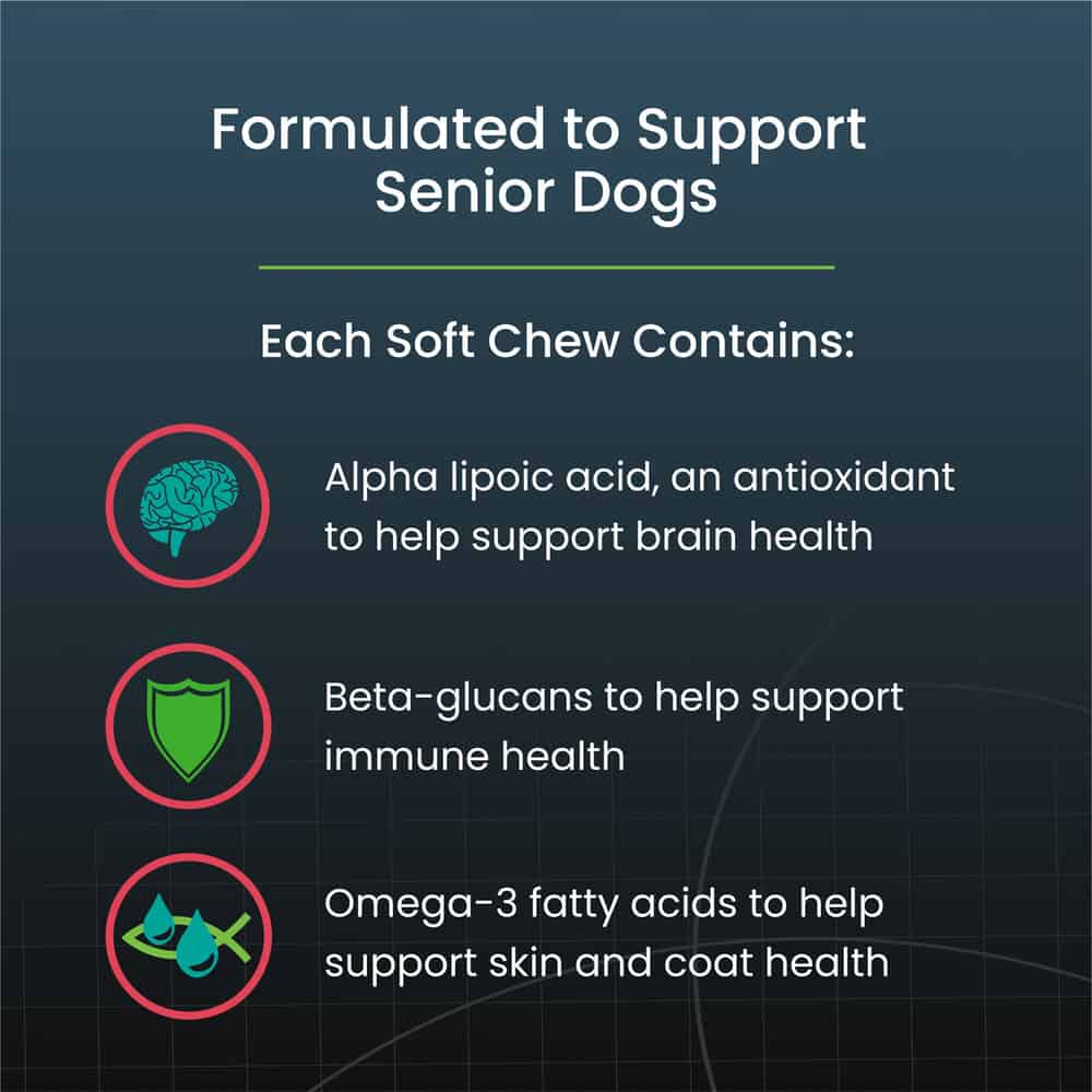 - Brain Health: Antioxidants are also included to help support brain health in senior dogs