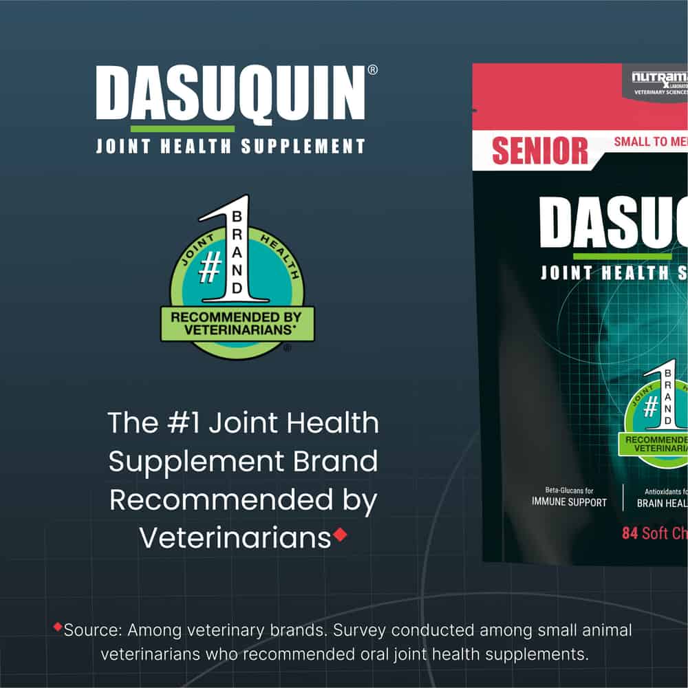 Dasuquin® is the #1 joint health supplement brand recommended by veterinarians and combines the demonstrated benefits of ASU, glucosamine hydrochloride, and chondroitin sulfate to help support joint health. Dasuquin® Senior also contains beta-glucans, omega-3's, and antioxidants to provide your senior dog overall wellness support. Dasuquin® joint health supplements are brought to you by Nutramax Laboratories Veterinary Sciences, Inc., the #1 veterinarian recommended supplement company. ◆Source: Among veterinary brands. Survey conducted among small animal veterinarians who recommended oral joint health supplements. *Source: Survey conducted among small animal veterinarians who recommended animal supplements.