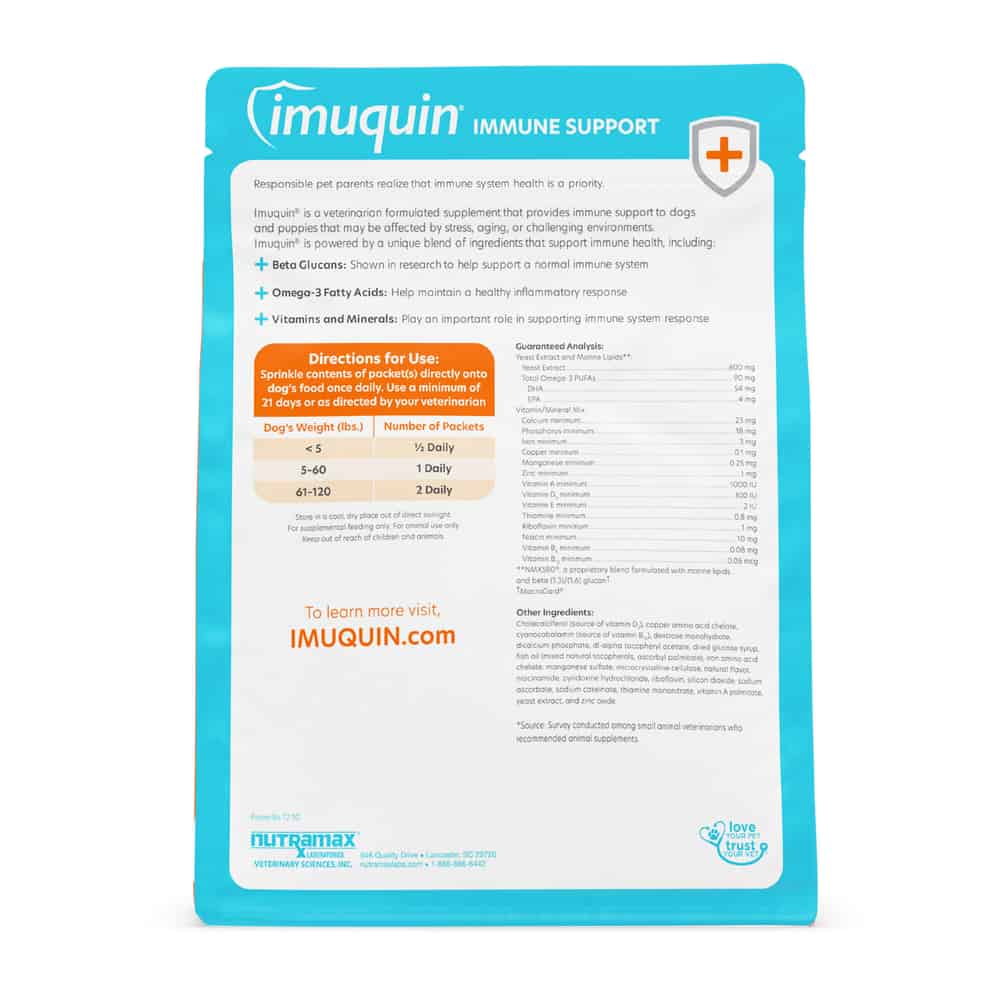 Imuquin is a veterinarian formulated supplement that provides immune support to dogs of all ages. The beta glucans in Imuquin help to support your pet's natural defense system - the immune system. Imuquin Immune Health Supplements are brought to you by Nutramax Laboratories Veterinary Sciences, the #1 veterinarian recommended supplement company. *Source: Survey conducted among small animal veterinarians who recommended animal supplements.