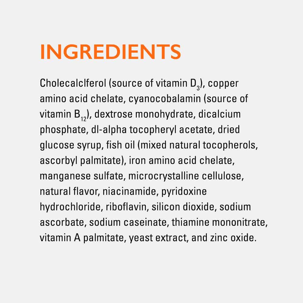 | Cholecalclferol (source of vitamin D3 ), copper amino acid chelate, cyanocobalamin (source of vitamin B12), dextrose monohydrate, dicalcium phosphate, dl-alpha tocopheryl acetate, dried glucose syrup, fish oil (mixed natural tocopherols, ascorbyl palmitate), iron amino acid chelate, manganese sulfate, microcrystalline cellulose, natural flavor, niacinamide, pyridoxine hydrochloride, riboflavin, silicon dioxide, sodium ascorbate, sodium caseinate, thiamine mononitrate, vitamin A palmitate, yeast extract, and zinc oxide. |
