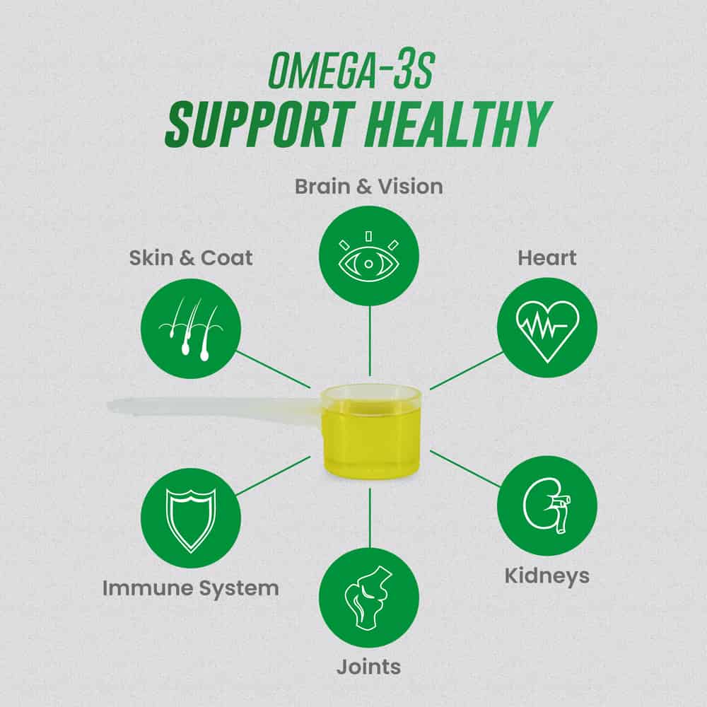 - Supports Several Functions - In addition to supporting skin and coat health, omega 3s help support joint, immune system, heart, kidney, brain, and vision health.