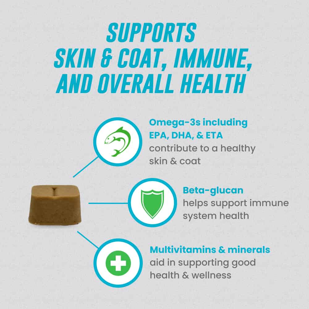 Incorporate the soft chews into your dog’s daily grooming routine. Give it as a reward after brushing their coat to reinforce a positive association and support their skin and coat health simultaneously. For picky eaters, pair the chew with a favorite mealtime treat.