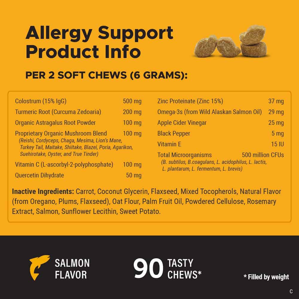 Pet Honesty’s Allergy Support soft chews are the tastiest and easiest way to help improve your dog's seasonal skin, food, & environmental allergies. Whether your dog is experiencing itchy skin, watery eyes, sneezing, excessive scratching, or paw licking, these allergy-fighting soft chews can help. These vet-recommended supplements are made with natural ingredients - like omega-3s, colostrum, and organic mushrooms - to support a healthy and normal immune system in your dog.