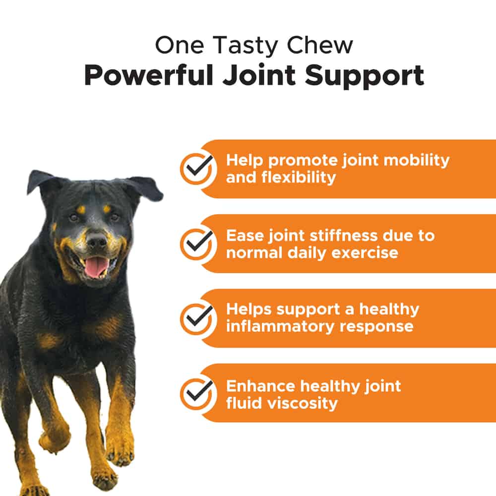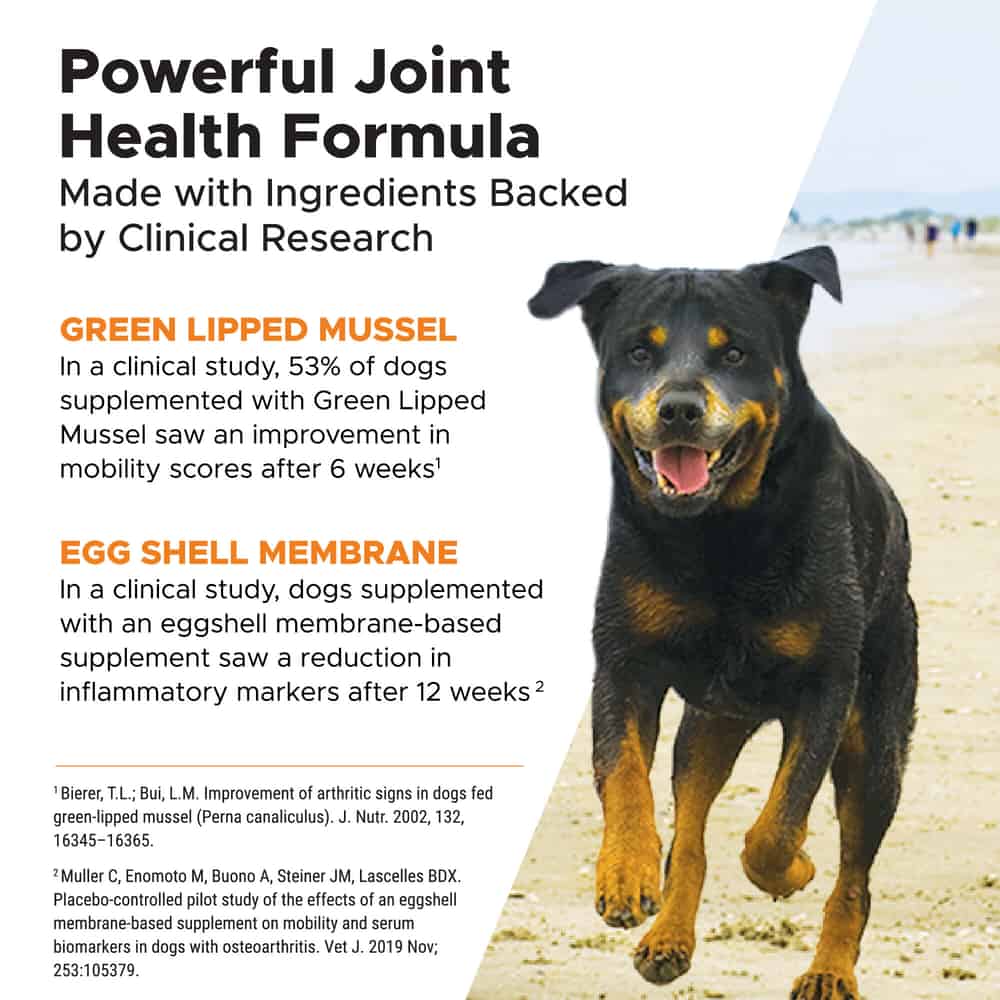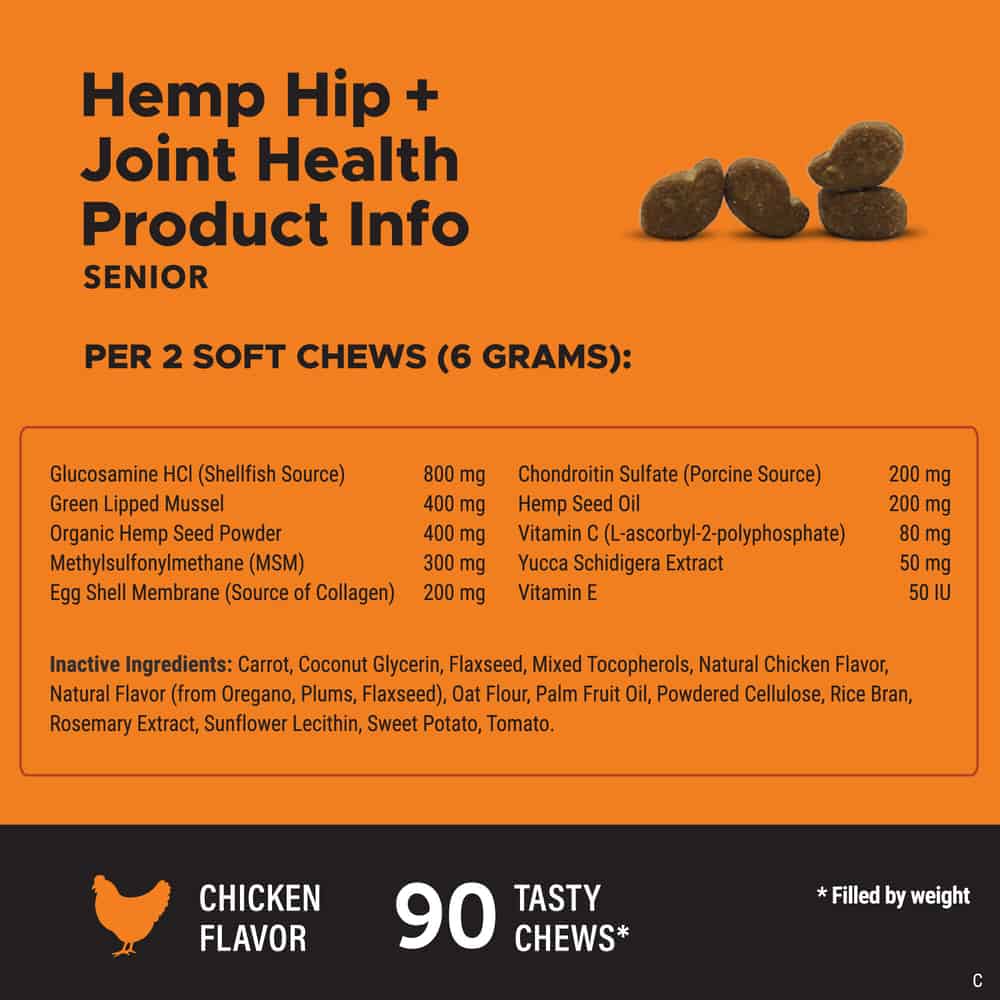 Ingredients: Glucosamine HCl (Shellfish Source), Green Lipped Mussel, Organic Hemp Seed Powder, PurForMSM® (Methylsulfonylmethane), Egg Shell Membrane (Balanced Kollagen®), Chondroitin Sulfate (Porcine Source), Hemp Seed Oil, Vitamin C (Stay-C®), Dried Yucca Schidigera Extract, d-alpha Tocopherol acetate (Vitamin E), Carrot, Coconut Glycerin, Flaxseed, Mixed Tocopherols, Natural Chicken Flavor, Natural Flavor (from Oregano, Plums, Flaxseed), Oat Flour, Palm Fruit Oil, Powdered Cellulose, Rice Bran, Rosemary Extract, Sunflower Lecithin, Sweet Potato, Tomato .